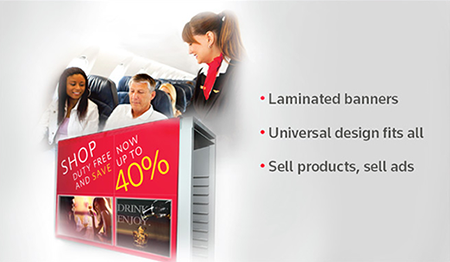 Uniquely patented, designed and universally sized, Trolley Topper laminated advertising banners drape perfectly across in-flight trolleys. The advertising and promotional messages they carry are targeted to seated passengers..and are especially effective for Duty Free products. Reminding customers about the substantial savings available on board stimulates Duty Free product sales. Regardless of which advertising message runs, these units enable new revenue through paid sponsorships sales.